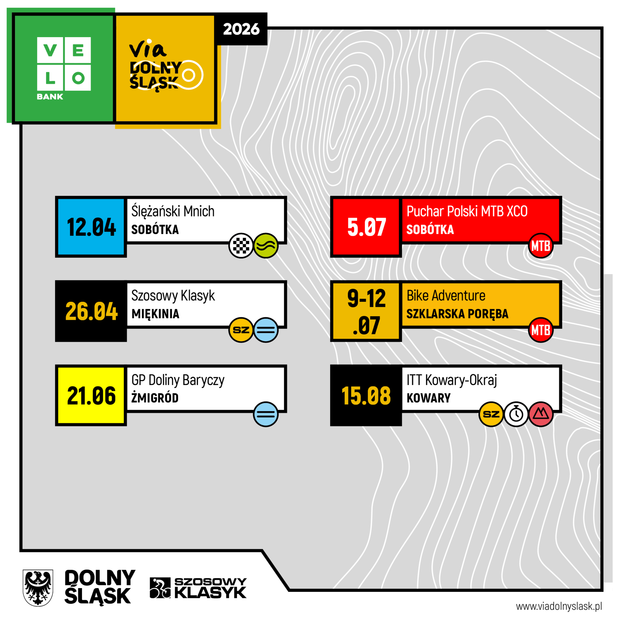 Tak prezentuje się kalendarz wydarzeń nad którymi patronat obejmuje VeloBank VIA Dolny Śląsk.